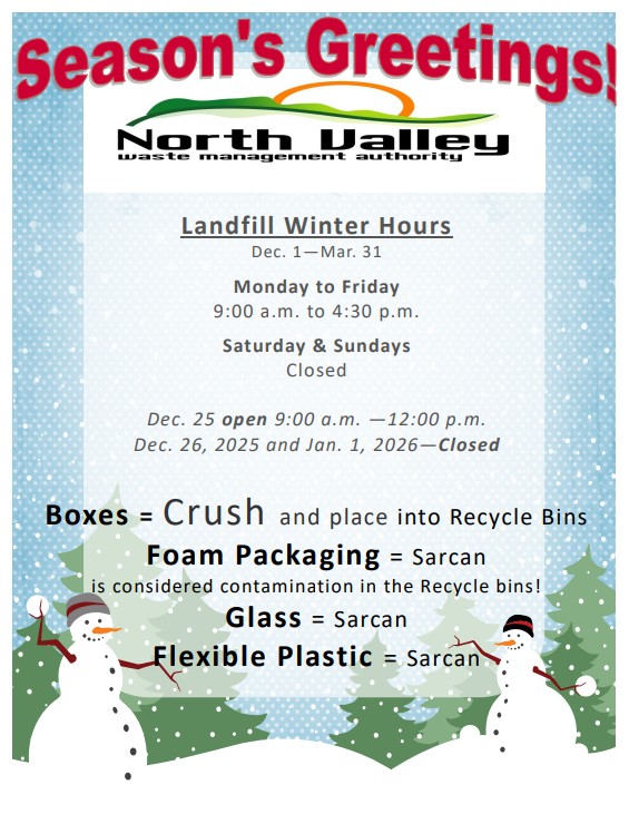 Home Seasons Greetings! Posted on1 December 202516 December 2025 seasons greetings Winter Hours 2025 Posted on17 December 2024 New Items Accepted Posted on9 December 20249 December 2024 Household Waste and Paint Posted on23 March 202423 March 2024 You can find more resources on this page: productcare.org/retailers Curbside Recycling – Items Accepted, Not Accepted Posted on12 April 202312 April 2023 Used Automotive Oil, Filters & Containers Posted on21 January 202321 January 2023 Free Wood Chips Posted on15 May 202218 May 2022 May 2022 Improvements Posted on10 April 202212 April 2022 Click for Full PDF Illegal Dumping Posted on7 June 202121 January 2023 Recycle Batteries Posted on16 March 202124 March 2021 Did You Know we have partnered with Call2Recycle to collect old batteries at the North Valley Waste Regional Landfill? Make a difference by recycling your used batteries.